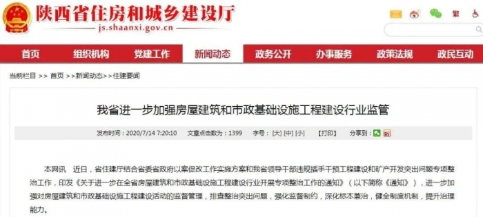 7月14日,陜西省住房和城鄉(xiāng)建設(shè)廳官網(wǎng)發(fā)布消息稱,近日印發(fā)了《關(guān)于進(jìn)一步在全省房屋建筑和市政基礎(chǔ)設(shè)施工程建設(shè)行業(yè)開展專項(xiàng)整治工作的通知》(以下簡稱《通知》),加強(qiáng)對房屋建筑和市政基礎(chǔ)設(shè)施工程建設(shè)活動(dòng)的監(jiān)督管理。