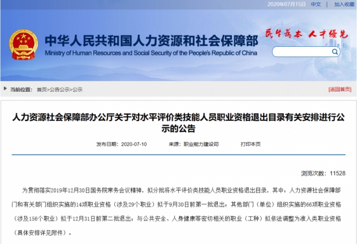 12月31日前,66項職業(yè)資格(涉及156個職業(yè))擬于第二批退出;