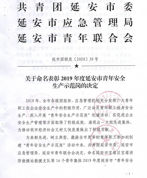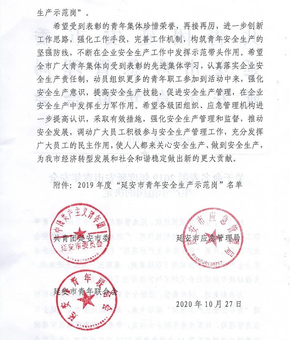 | 公司多個集體榮獲“延安市青年安全生產(chǎn)示范崗”稱號 |