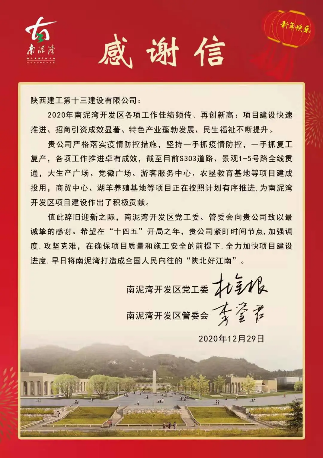 近日,陜建十三建公司收到了來自南泥灣開發(fā)區(qū)黨工委、南泥灣開發(fā)區(qū)管委會發(fā)來的感謝信。