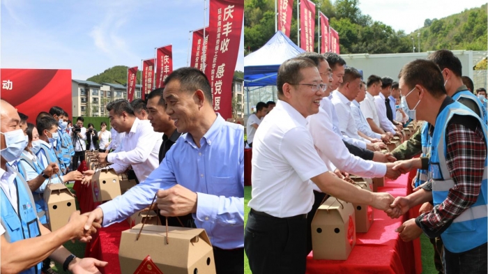 慰問活動現(xiàn)場,與會領導為農(nóng)民工朋友們發(fā)放慰問品,并隨后觀看了“慶豐收、感黨恩”慰問演出。