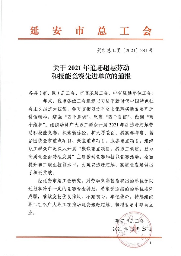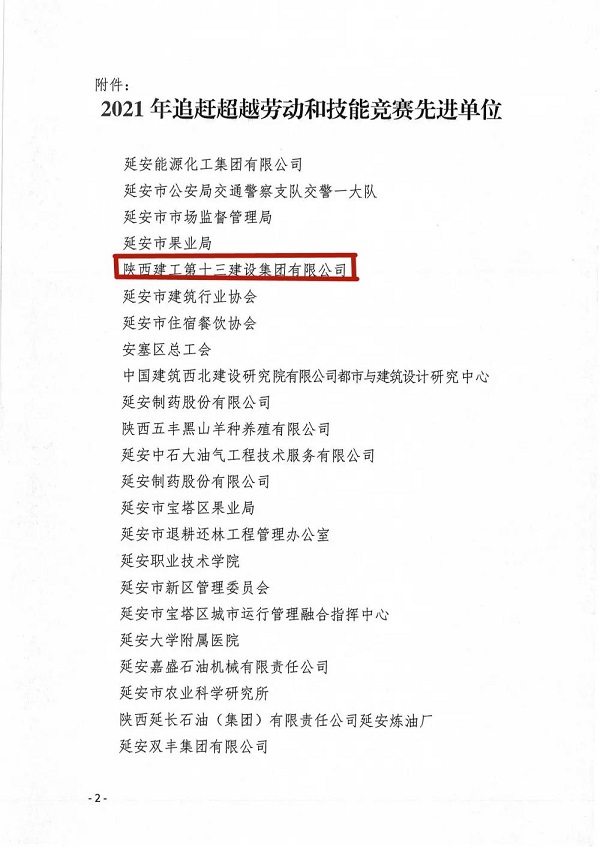 近日,延安市總工會公布了2021年追趕超越勞動和技能競賽先進單位名單。陜建十三建集團榮獲延安市2021年追趕超越勞動和技能競賽先進單位。
