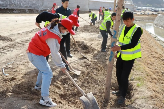 活動現(xiàn)場,大家熱情高漲、干勁十足,三五人一組,分工合作,揮鍬鏟土,放置樹苗,提水澆灌,踏土正苗,每道工序都有條不紊,到處一片熱火朝天的勞動場景。經(jīng)過2個多小時的辛勤勞動,一排排綠柳整齊地挺立在河道兩旁,為紅色南泥灣增添了一抹新綠、播種了一份希望。