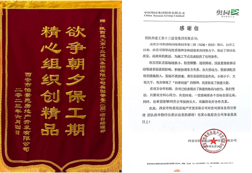 信中提到,陜建十三建集團(tuán)自承建奧園譽(yù)峯(二期)項(xiàng)目以來,重合同、守信用,各項(xiàng)管理工作有序開展,項(xiàng)目建設(shè)穩(wěn)步推進(jìn)。在項(xiàng)目建設(shè)期間,項(xiàng)目全體參建人員認(rèn)真籌劃部署,緊盯目標(biāo)任務(wù),抓進(jìn)度趕工期,主動攻堅(jiān)克難,增加資源投入,積極配合工程業(yè)主、監(jiān)理單位和行政管理部門,以不畏艱難、勇挑重?fù)?dān)的精神,為施工節(jié)點(diǎn)完成提供了有利條件。
