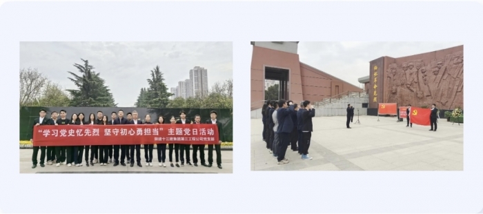 3月29日-4月3日,陜建十三建集團(tuán)各單位積極組織黨員干部職工開展“學(xué)習(xí)黨史憶先烈·堅(jiān)守初心勇?lián)?dāng)”清明節(jié)主題黨日活動(dòng),旨在銘記歷史,緬懷先烈,激勵(lì)大家勇于擔(dān)當(dāng)、奮進(jìn)前行,助推企業(yè)高質(zhì)量發(fā)展!