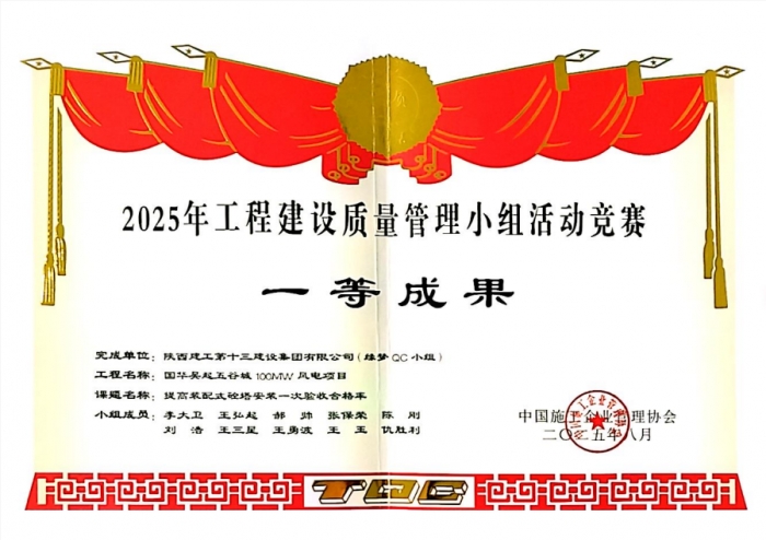 近日,中國施工企業(yè)管理協(xié)會公布了“2025年工程建設(shè)質(zhì)量管理小組成果大賽”獲獎名單,集團(tuán)國華吳起五谷城100MW風(fēng)電項目“緣夢QC小組”參賽成果《提高裝配式砼塔安裝一次驗(yàn)收合格率》獲得大賽一等獎。